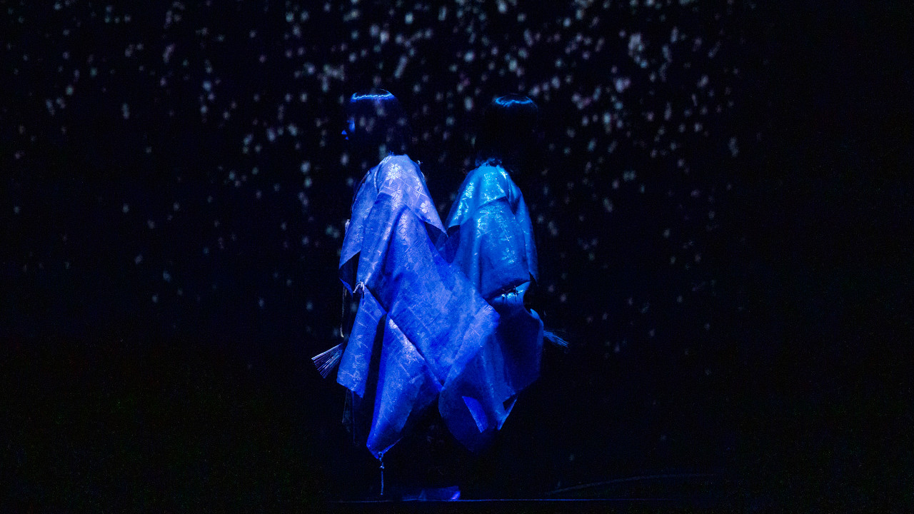 実体の鏡像を用いているため、プロジェクタによる空中映像投影とは異なり強い立体感が得られる。加えて、コンピュータ制御の照明によってどちらの像が見えるかを制御し、観客からはいまどちらの側の能楽師を見ているのか、区別ができない舞台を構築した。また能楽師の身体を遠赤外線カメラで撮影し、その身体の動きを反映したCG映像を舞台横側に設置したスクリーンに投影することで、能楽師と映像との重ね合わせにおいて奥行きを一致させることができ、舞台上のスクリーン前で俳優が演技する従来手法に比べより整合性のある映像投影を可能とし、映像と実像との境目を曖昧にした。