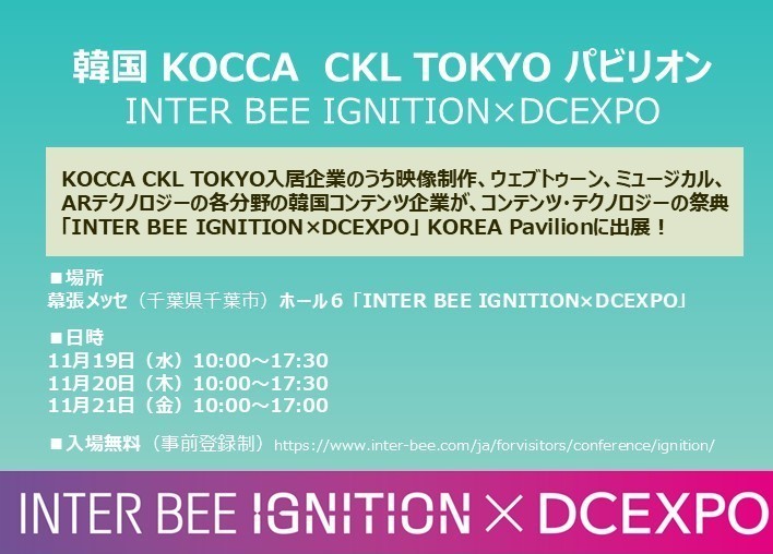 この「INTER BEE IGNITION × DCEXPO」に今年、韓国のコンテンツ業界をリードする企業5社が、日本市場への展開を目指し、「韓国KOCCA CKL パビリオン」として出展いたします!